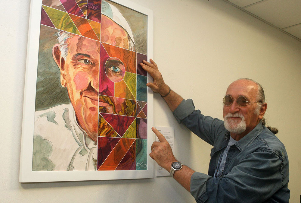 “Francristo” combina acrílico y lápices de colores, y plasma sobre tela una fusión de los rostros del sumo pontífice y de Cristo en una sola persona.