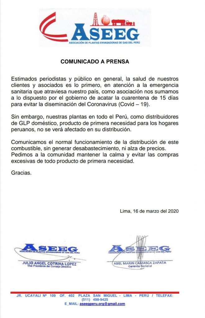 La Asociación de Plantas Envasadoras de Gas del Perú (Aseeg) aseveró hoy que sus plantas en todo el Perú, como distribuidores de GLP doméstico, producto de primera necesidad para los hogares peruanos, no se verá afectado en su distribución.