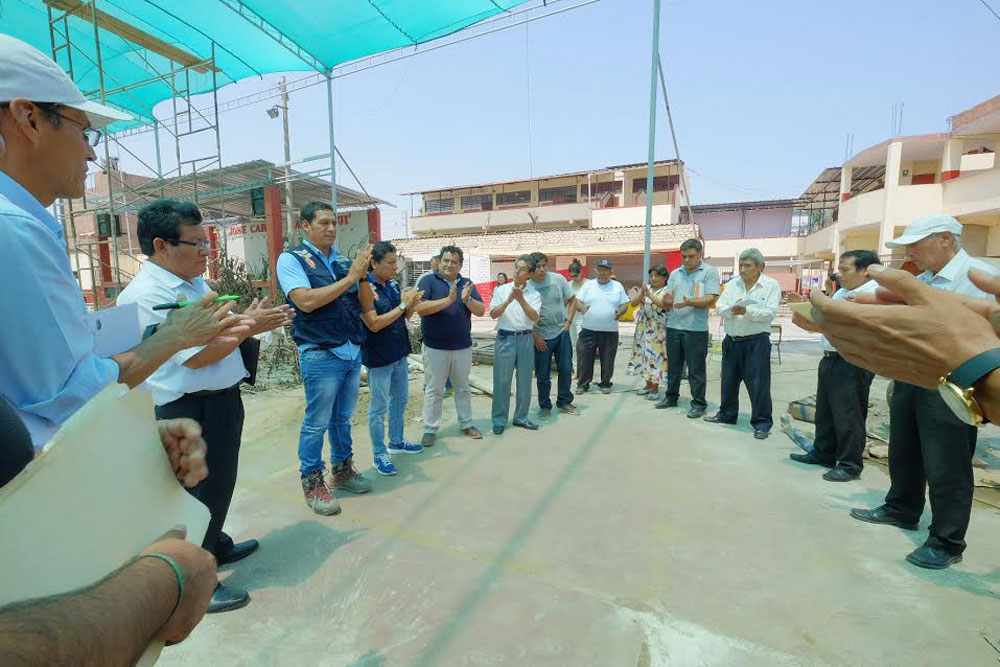 En la I.E. Víctor Raúl Haya de la Torre, en Buenos Aires norte le informaron que con apoyo de la municipalidad distrital de Víctor Larco erradicaron 5 mil m3 de barro y que colapsó el toldo del patio principal, Allí observó cómo se avanzaba en la limpieza y fumigación de todos los ambientes.