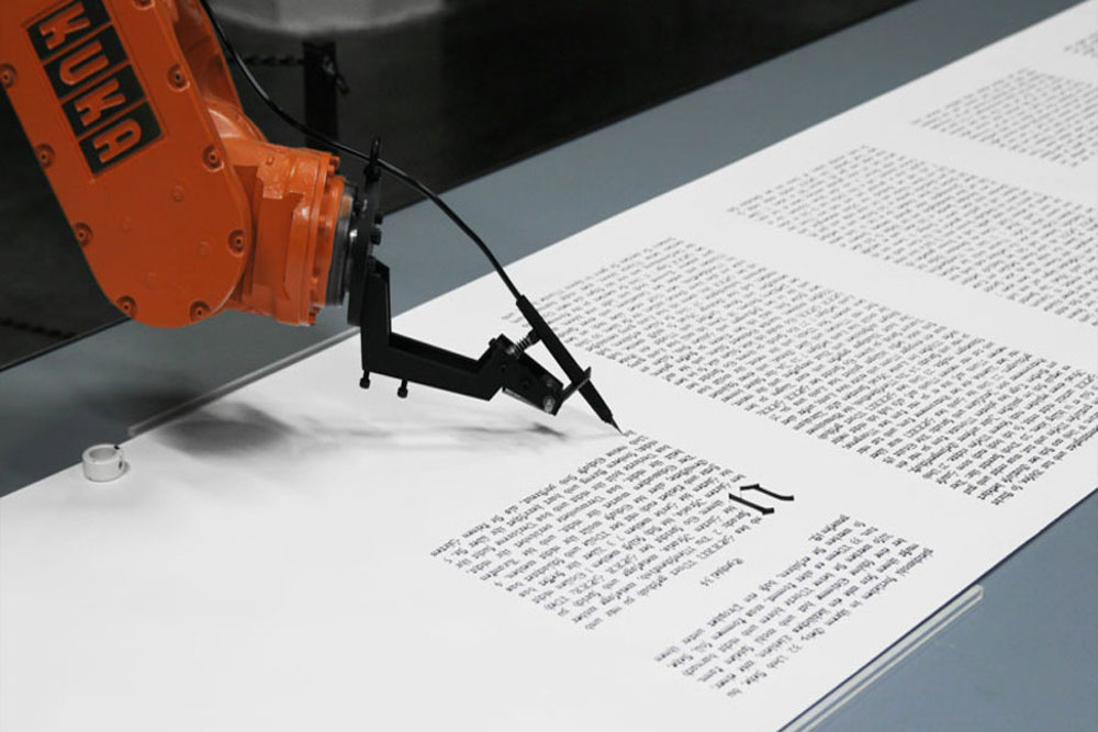 “Antes era un robot industrial que hacía un trabajo duro y se movía en un mundo competitivo, pero lo liberamos”, explica el alemán Jan Zappe, quien junto con sus compatriotas Martina Haitz y Matthias Gommel, conforma el grupo artístico “robotlab” que se encuentra detrás de este “autor mecanizado”. Sin necesidad de musas que lo inspiren, este robot escribe manifiestos de forma ininterrumpida.