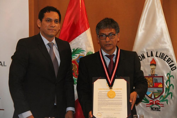 El gobernador regional de La Libertad, Luis Valdez Farías, entregó ayer la Medalla de La Libertad al doctor William Rabanal Palacios, por la labor realizada como fiscal provincial delegado de la Fiscalía Especializada Corporativa contra el Crimen Organizado, la que ha permitido desarticular a 17 grupos criminales y capturar a 270 delincuentes.