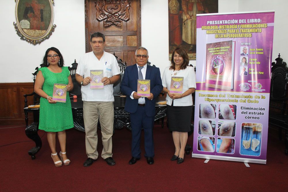 El Fondo Editorial de la Universidad Nacional de Trujillo (UNT) presentó en el Paraninfo, el libro: “Fisiología, Histología y Formulaciones Magistrales para el Tratamiento de Hiperqueratosis”, de los autores Dr. Oscar Ramiro Lecca Briones, Dra. Carmen Luisa Marín Tello y Dr. César Leopoldo Lombardi Pérez.