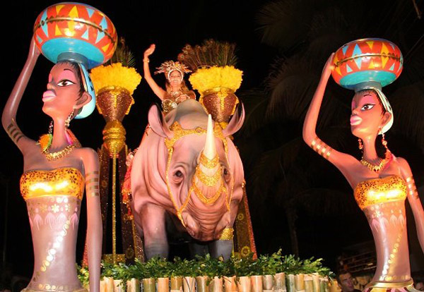 Es así, que la reina del carnaval, S.M. Mariana I, logro captar cientos de miradas al recorrer las calles del balneario en un carro alegórico que hacía alusión a que iba montada sobre un majestuoso rinoceronte acompañado de dos africanas a los costados.