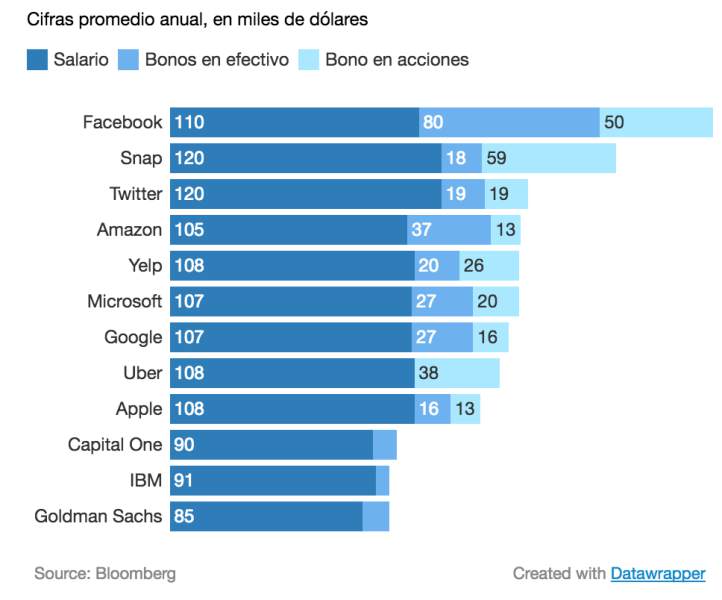 Según datos recaudados por Jesse Collins, un practicante que pasó a ser empleado de tiempo completo en Silicon Valley, el salario anual promedio para un trabajador en su primer año en Silicon Valley supera los US$105.000, además de casi de US$13.000 en acciones y bonificaciones en efectivo cercanas a los 26 mil dólares.