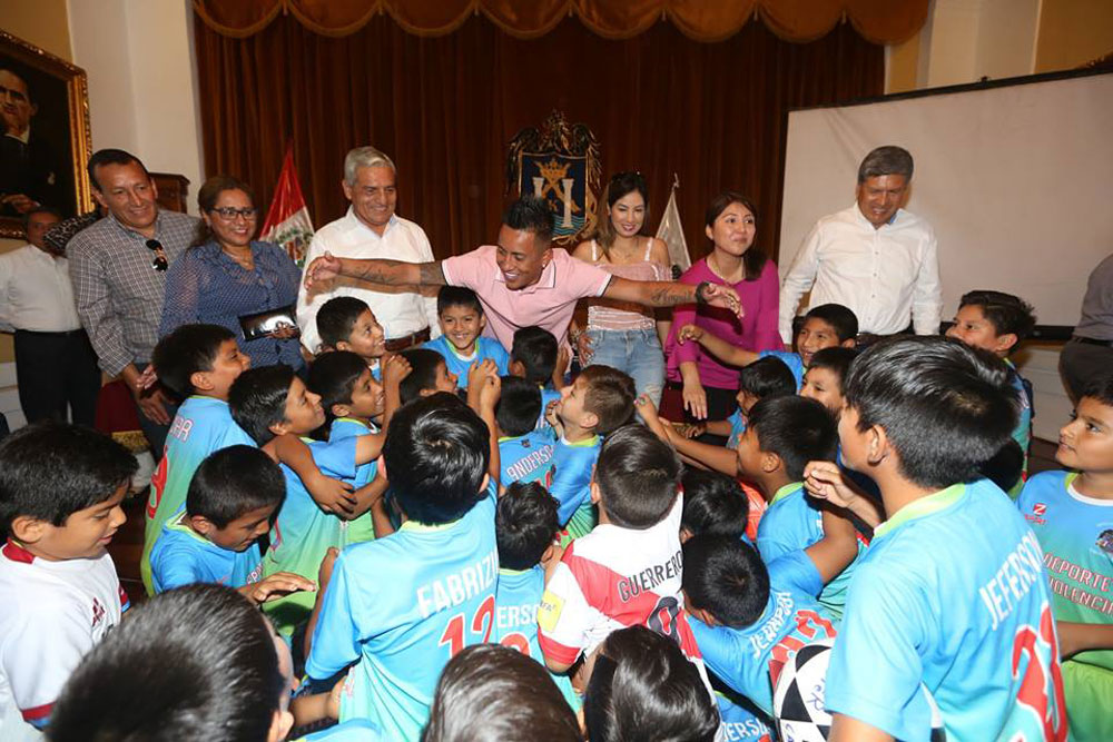 Un merecido homenaje recibió nuestro seleccionado nacional Christian Cueva Bravo, durante una ceremonia realizada en el salón consistorial de la Municipalidad Provincial de Trujillo (MPT), con la presencia de los niños que forman parte de la escuela deportiva municipal de fútbol.