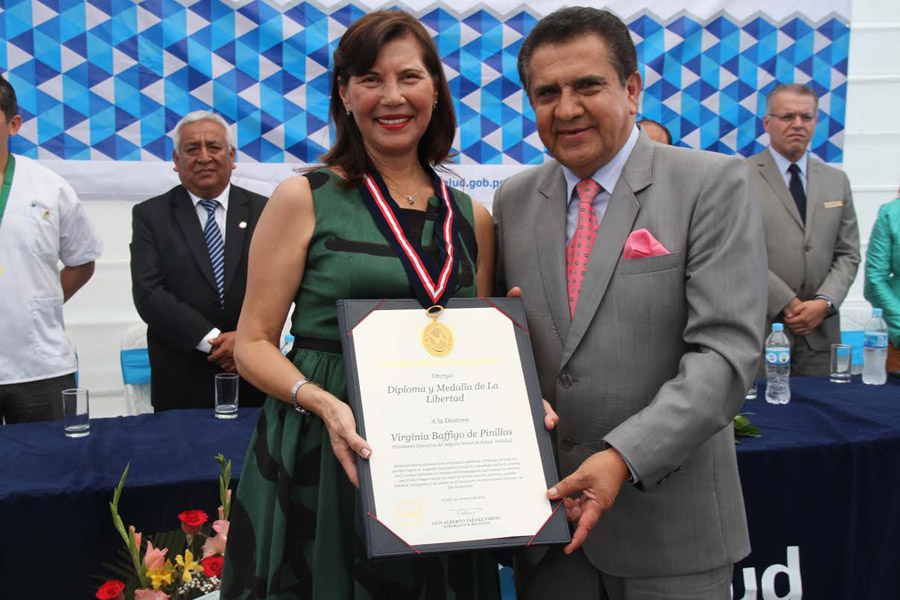 El Gobierno Regional de La Libertad (GRLL) distinguió con Diploma y Medalla de La Libertad a la doctora Virginia Baffigo de Pinillos, presidenta ejecutiva de EsSalud. Fue durante la ceremonia central por el 65° aniversario de creación del hospital Víctor Lazarte Echegaray, el que anunciaron será mejorado integralmente.