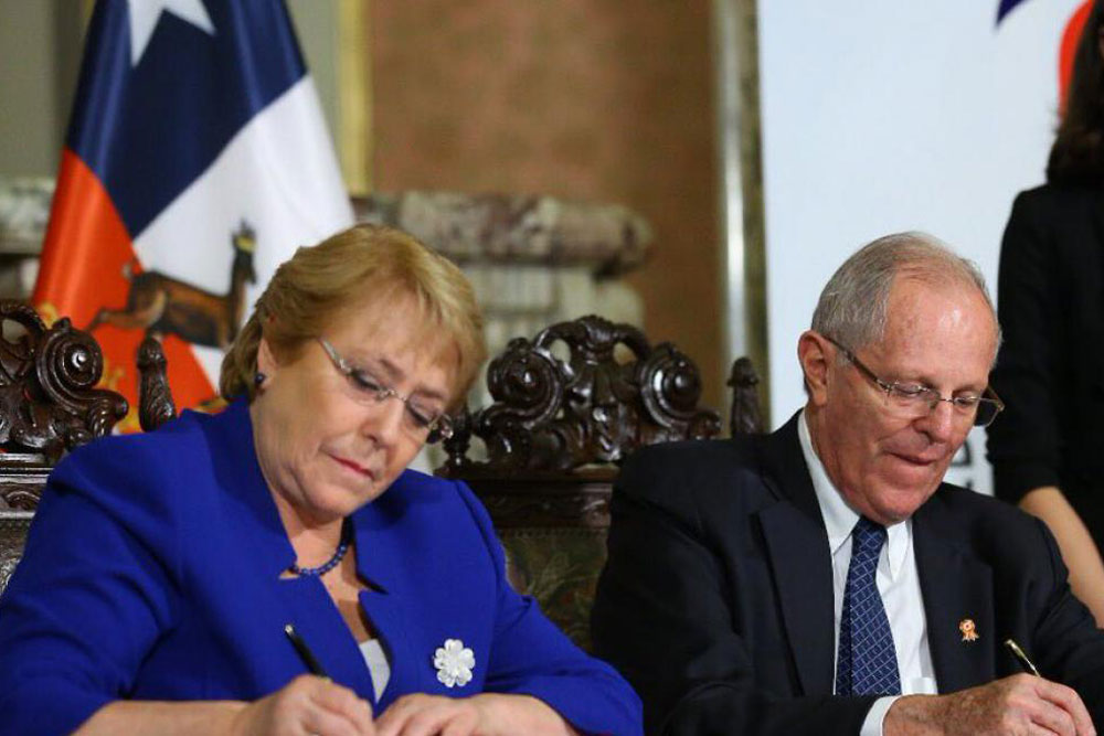 El convenio fue suscrito por el ministro de Transportes y Comunicaciones, Bruno Giuffra Monteverde, y su homóloga chilena, la ministra de Transportes y Telecomunicaciones, Paola Tapia Salas, en presencia de los presidentes del Perú Pedro Pablo Kuczynski y de Chile, Michel Bachelet.