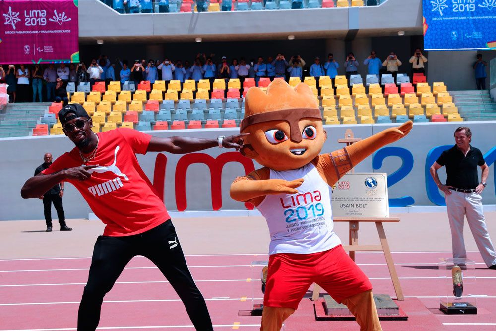 Usain Bolt estuvo acompañado en su visita al estadio por el presidente del comité organizador de Lima 2019, Carlos Neuhaus, el alcalde de la capital peruana, Jorge Muñoz, y Milco, la mascota de los próximos Panamericanos, inspirada en el cuchimilco, una figura de cerámica de las antiguas civilizaciones prehispánicas de Perú.