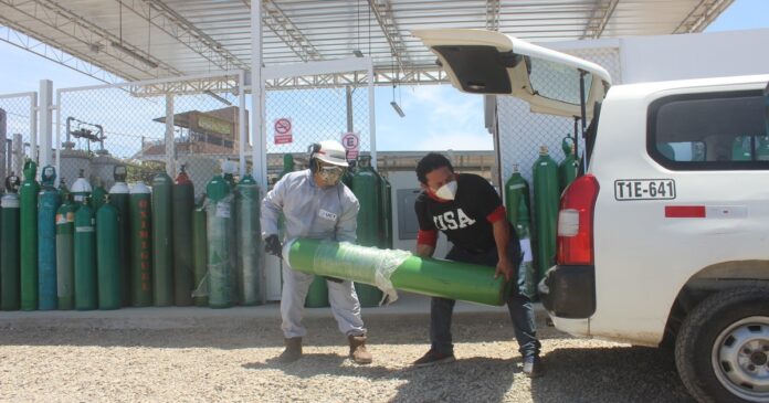 Los cilindros de 10 metros cúbicos son llenados en un espacio acondicionado en la Universidad Católica de Trujillo, en Moche, hasta donde llegan diariamente vehículos con familiares de pacientes afectados por este mal, en la búsqueda de este preciado insumo. Luego de recibir la debida desinfección protocolar, hacen su ingreso hasta la planta de oxígeno para la entrega o recojo del balón.