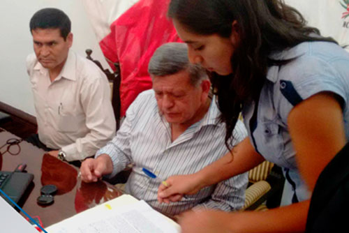 La suscripción de la transferencia se hizo con intervención de la Notaria Polo Muñoz, quienes dieron fe del acto, la participación del consejero regional de Sánchez Carrión, Confesor Bermúdez y en representación del burgomaestre -que previamente ya había firmado las actas-, el asesor legal José Loje Velásquez.