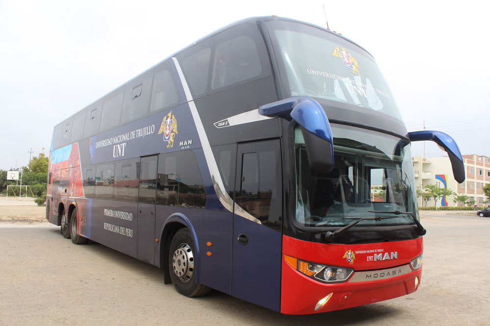 La Universidad Nacional de Trujillo (UNT) adquirió una moderna unidad de transportes -ómnibus interprovincial- de procedencia alemana, la misma que será destinada al uso de alumnos, docentes y personal administrativo, durante la programación anual de actividades académicas, de investigación y proyección social, tanto para viajes nacionales como internacionales.